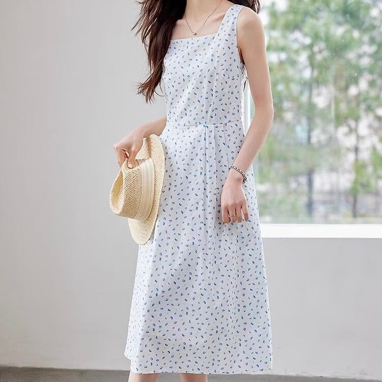 スクエアネックが顔周りをすっきりと見せる、プリントミモレ丈Aラインワンピース。