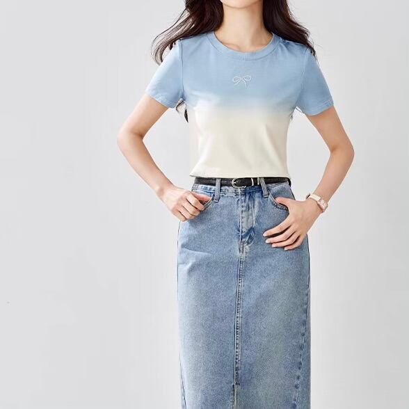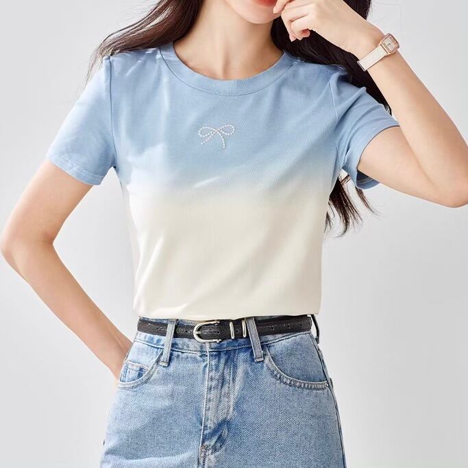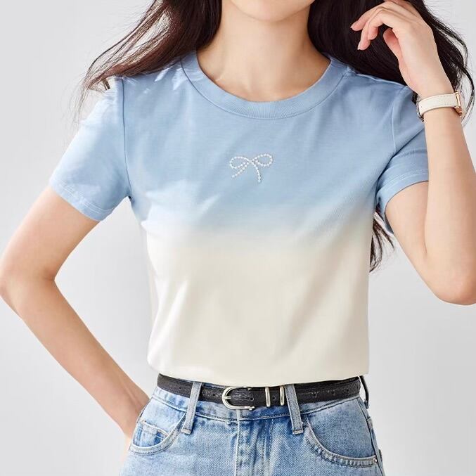 グラデーションとリボンプリントが魅力的な半袖Tシャツ。