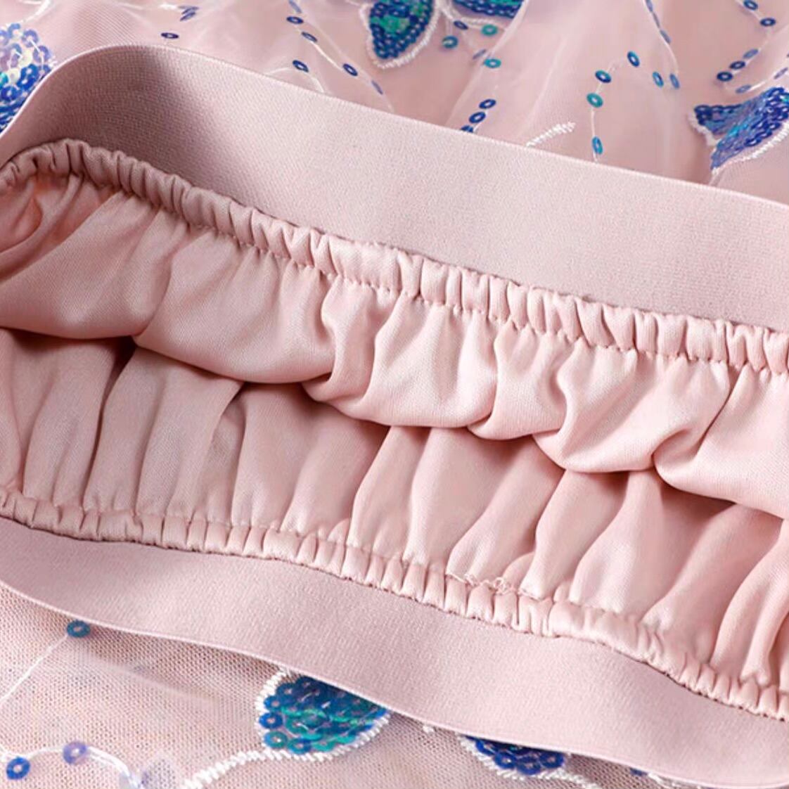 軽やかな素材感が魅力的で、歩くたびにきらめく蝶が優雅な雰囲気を演出します。