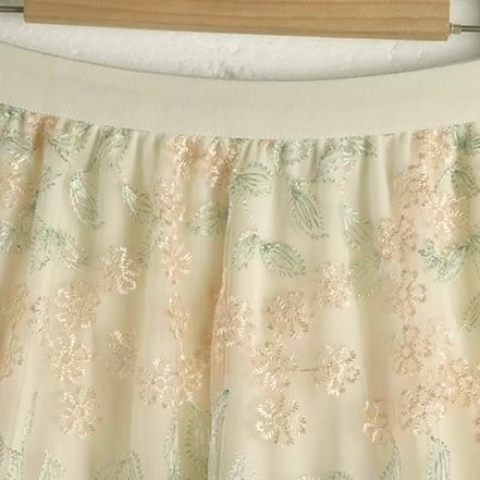 ウエストゴムで楽ちんな着心地のミディ丈スカート。繊細なフラワーレース刺繍が、女性らしい上品さを演出します♡ デイリーユースはもちろん、お出かけスタイルにもぴったり。