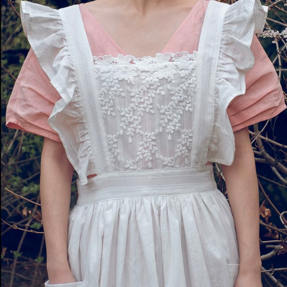 日常を楽しく彩る白エプロン。シンプルなデザインだからこそ、どんな場面でも違和感なく着用できます。