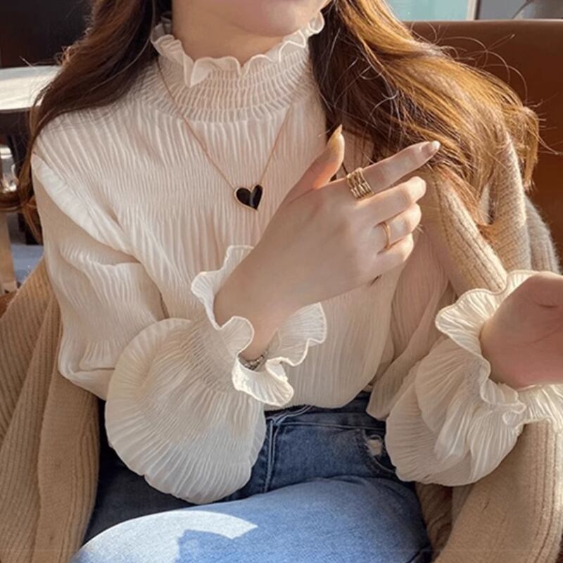 襟元と袖口のフリルがかわいらしく合わせやすいブラウスです。